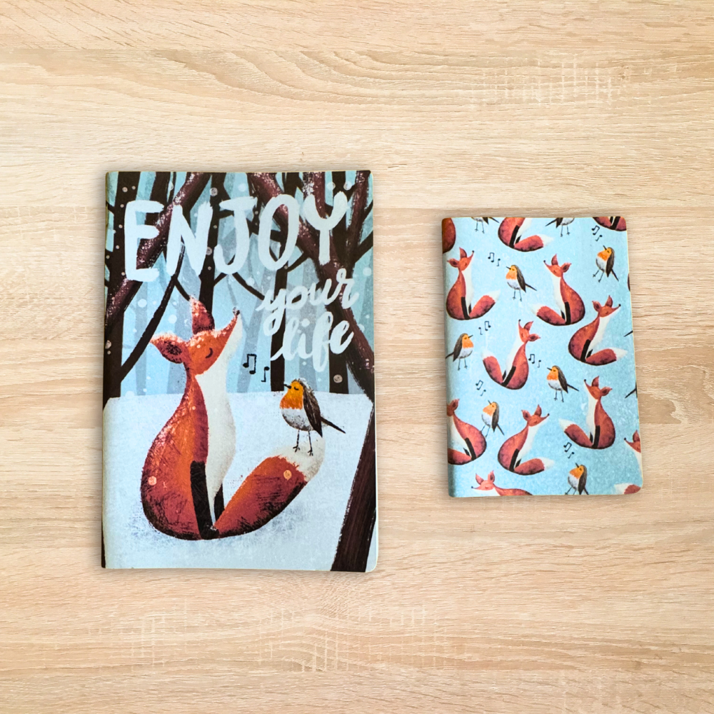 - Quaderno A5 (40 pagine bianche) – con copertina illustrata: una volpe e un pettirosso nel bosco ti ricordano di goderti la vita, una pagina alla volta.